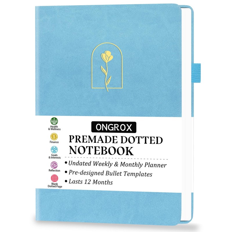 • PREMIUM QUALITY: This A5-size (8.4''×5.8'') prefilled dotted notebook combines luxury and function. It features a vegan leather hardcover, thick 120gsm paper, three ribbon bookmarks, a pen loop, an elastic closure band, and an inner pocket.