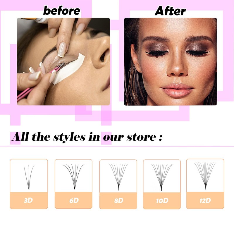 - PRODUCT SPECIFICATIONS: Premade lash fans, 3d 6d 8d 10d 12d, C/D curl, the thickness of the lashes is 0.05/0.07, the length of the lashes is a mix of lengths from 8-15mm, there is always one for you!