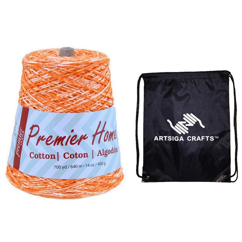 BUNDLE: Premier Home Cotton Multi Knitting Yarn Tangerine Splash 1 Cone 1032-04 Bundle with 1 Artsiga Crafts Project Bag. DESCRIPTION: Premier Knitting Yarn Home Cotton Multi is a soft cotton/polyester blend is perfect for washcloths and home decor projects. WEIGHT CATEGORY: 4; Content: 85% Cotton/15% Polyester; Putup: 14oz/400g, 700yd/640m; Gauge: 18sx24r = 4in/10cm on size US8/5mm knitting needles; Suggested crochet hook size US I-9/5.5mm. DYE LOTS: Skeins in the same Factory-Pack share the same Dye Lot, when buying multiple bags we try but are not always able to match DYE LOTS; Care: machine wash, tumble dry, do not bleach, do not iron, do not dry clean. PROJECT BAG: Artsiga Project Bag measures 13 x 16 inches; includes a drawstring for easy closure and shoulder straps for easy carry-on and keeping projects on-the-go.