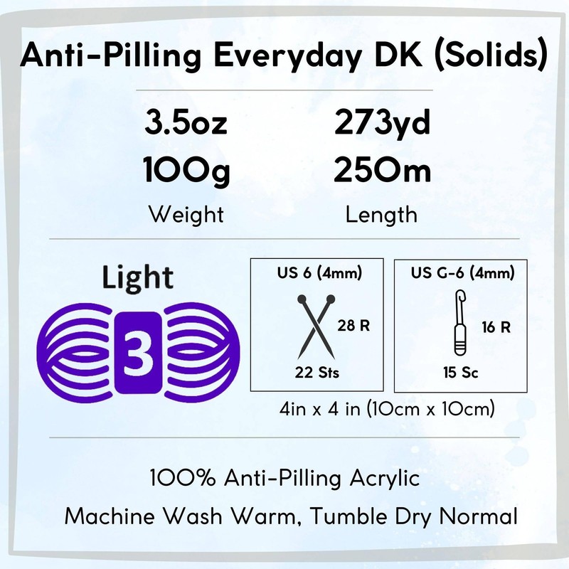 - The same Premier Anti-Pilling fiber you know and love, but now in a lighter weight, Premier Anti-Pilling Everyday DK! Our exclusive Anti-Pilling acrylic fiber means your project will look fresh and beautiful wash after wash; In a wide array of colors, the possibilities are endless; Craft comfortably knowing that this yarn is safe for everyone! It has passed the highest standard, suitable for direct contact with the most sensitive skin, even babies and small children
