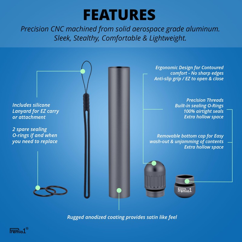Premio1 Slim Storage Tube, Odor Locking Smell Proof, Waterproof Lightweight Container, Pre-rolls, Cones, Herbs, Spices, Pills,… Outdoor EDC Metal Holder, Ergonomic Pocket Size Travel, Cool Gray