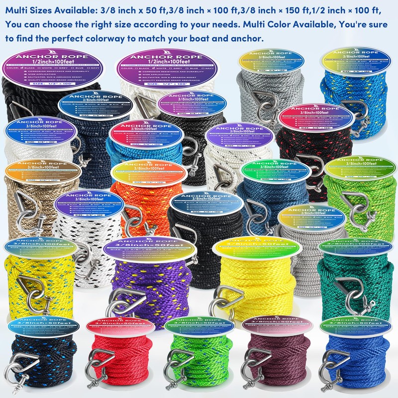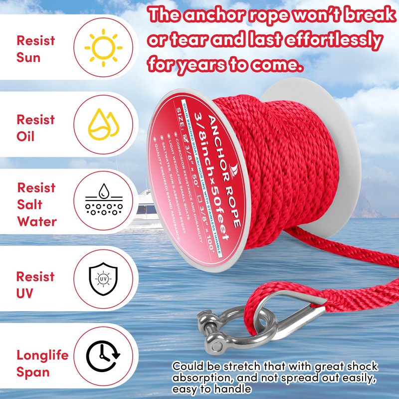 - 【MFP Material】MFP anchor rope 50 ft designed for boat.boat anchor rope 3/8 inch is made of braided polypropylene that offers superior strength and flexibility,It can effectively absorb shocks or any shaking movement caused by mooring, towing. anchor line rope resist saltwater, gas, oil, acids, abrasion and UV.our braided anchor line soft and limits scratching to your boat’s finish.marine rope intended for boats up to 18'. Breaking strength: 1565lb/Recommended maximum working load:310lb.