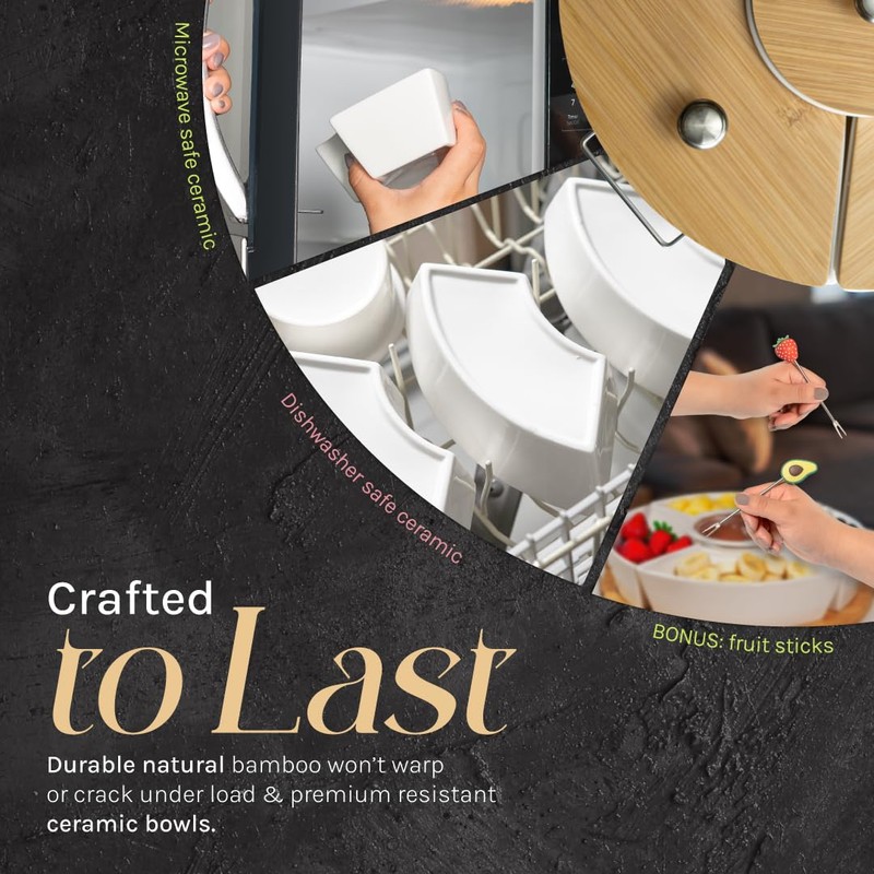 - High-Quality Bamboo & Ceramic: This Premium Bamboo & Ceramic Chip and Dip Set features a charming chip and dip bowl made with durable bamboo and smooth ceramic. Microwave, oven, and dishwasher-safe, it’s perfect for family snacks and gatherings.