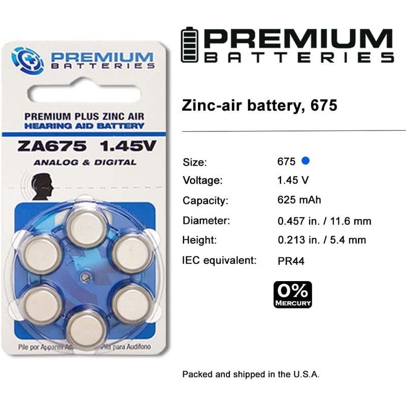 Premium Batteries Size 675, ZA675, PR44, P675 1.45V Zinc Air Hearing Aid Batteries Blue Tab (6 Batteries)