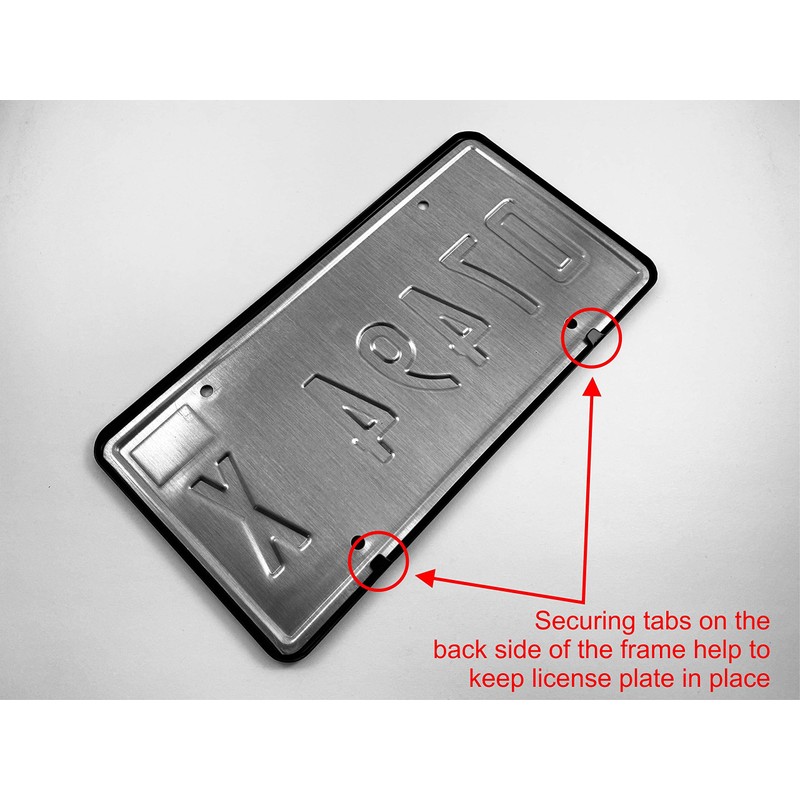 - Each frame has 2 top holes and 2 securing tabs on the back side of it in order to keep your license plate in place..