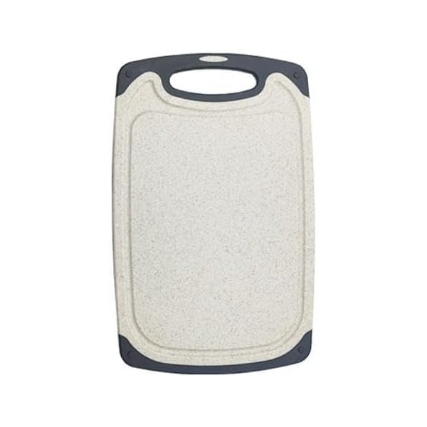 Elevate your food preparation experience with this premium cutting board featuring a practical two-tone design. The durable construction combines a light-colored cutting surface with dark gray non-slip grips on the sides for secure handling. The generous size provides ample space for chopping, slicing, and dicing, while the ergonomic handle makes it easy to transport from counter to table. A thoughtfully designed juice groove around the perimeter helps contain liquids and prevent spills. The textured surface offers excellent knife control while being gentle on your blades. This versatile board is perfect for everyday meal prep, from chopping vegetables to carving meats. The sturdy construction ensures stability during use, while the sleek profile allows for convenient storage. Easy to clean and maintain, this cutting board is an essential tool for any kitchen.