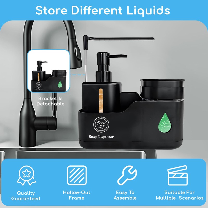 Premium Dual Chamber Soap Dispenser Set - (Black) Hand Soap & Dish Soap Dispenser with Hollow-Out Storage Rack for Sponges and Brushes - Space Saver Countertop Organizer for Kitchen and Bathroom