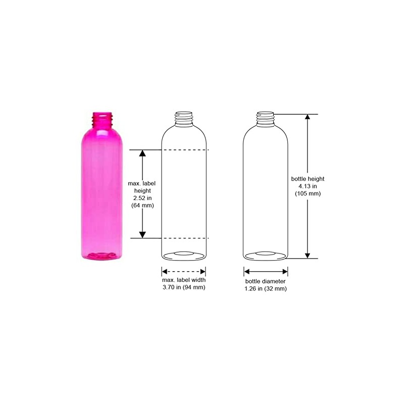 Pack of 12 empty, fillable bottles with 12 smooth natural color press down disc caps. Cosmo Round/Bullet shaped bottles are made of BPA-free PET plastic. Bottles are made in USA from new material. Caps are made in the USA or are imported. Recyclable. Bottle capacity is 2 ounces (60ml). Bottle height: 4.13" (105 mm). Bottle diameter: 1.26" (32 mm). Cap size is 20/410 and is made of BPA-free material. Dispensing disc caps open by pushing down on one side and close by pushing down on the other side. Lightweight and high quality packaging. Use to easily store and secure travel and homemade products, shampoo, conditioner, hair color, gel, body soaps, paints, ink, art supplies, cleaning supplies, diluted essential oils, dish soap, hair treatments, and other liquids.