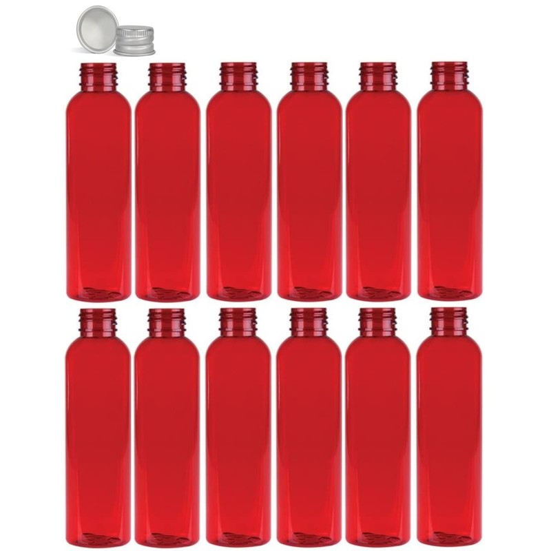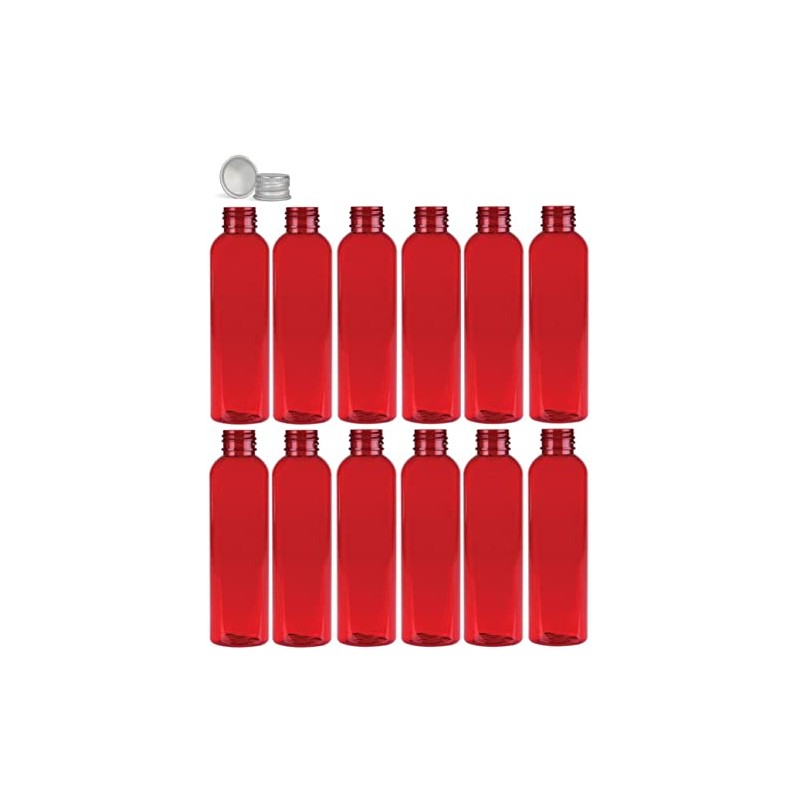 Premium Essential Oil 4 Ounce Cosmo Round Bottles, PET Plastic Empty Refillable BPA-Free, with Silver Aluminum Lined Non-Dispensing Caps (Pack of 12) (Red)
