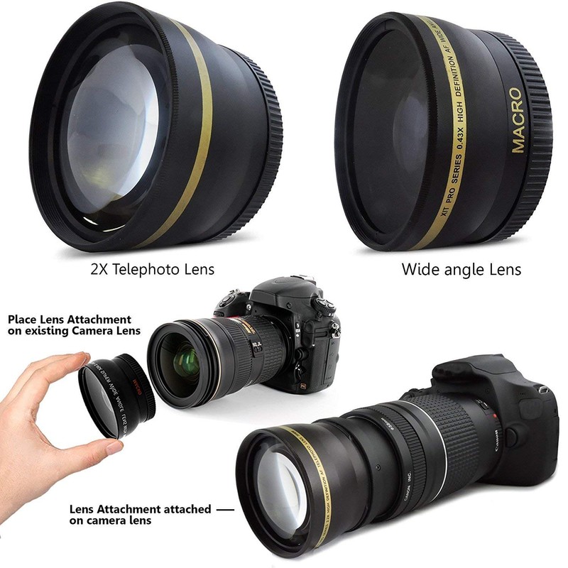 Premium 52mm Accessory Kit for NIKON DSLR Cameras - Includes: 52MM High Definition Wide Angle Lens with Macro Closeup feature + 52mm High Definition 2X Telephoto Lens + Professional Speedlight Flash + 52mm 3 Piece HD Filter Set + + 52mm Tulip shaped Hard Lens Hood + 52mm Soft Rubber Lens Hood + 52mm Lens Cap + Lens Cap Holder + Universal Memory Card Reader + Mini Table Tripod + Memory Case Holder + Screen Protectors + Mini Blower + Cleaning Pen + Deluxe Cleaning Kit + Ultra Fine Cleaning Cloth. THE LENSES SCREW IN TO YOUR EXISTING CAMERA LENS