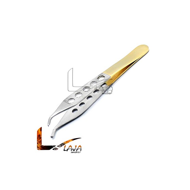 Premium HIGH Grade ADSON Tissue DISECTING Forceps 1X2 Teeth 4.75" Curved Angled with FENESTRATED Gold Handle (LAJA IMPORTS Brand)