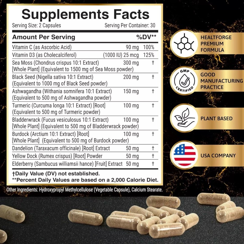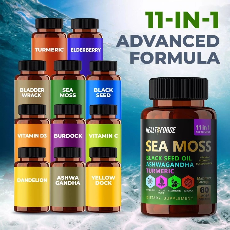 - 11-in-1 Sea moss capsules Supplement Blend: This powerful complex of seamoss is enriched with a blend of seamoss, black seed oil, ashwagandha, burdock root, turmeric, bladderwrack, dandelion, elderberry, yellow dock, Vitamin C, and Vitamin D3.
