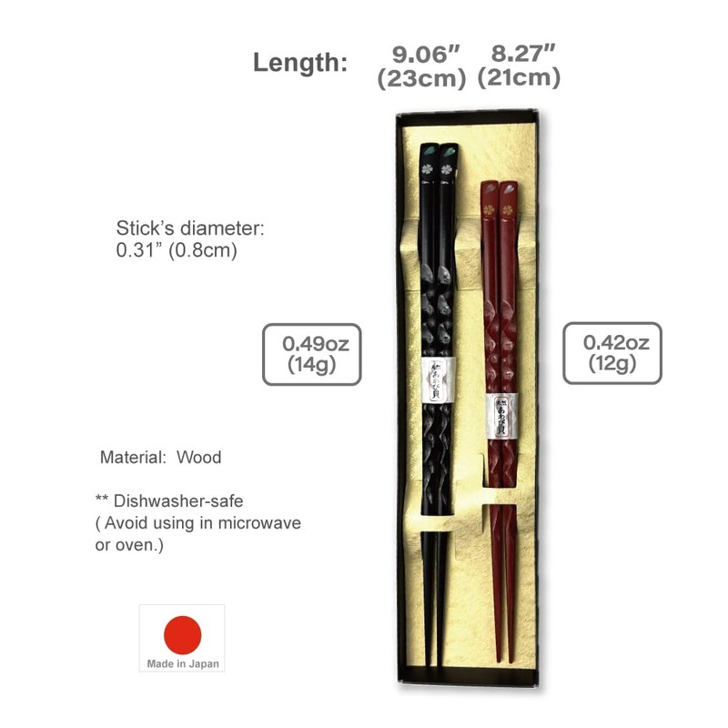 - [ Sizes, Weight and Material ] Chopsticks 1 Black: 9.06 × Diameter 0.31 inch (23 × Diameter 0.8 cm) Weight: 0.49 oz (14 g) Chopsticks 2 Red: 8.27 × Diameter 0.31 inch (21 × Diameter 0.8 cm) Weight: 0.42 oz (12 g) each Material: Wood ** Dishwasher-safe ( Avoid using in microwave, or oven.)