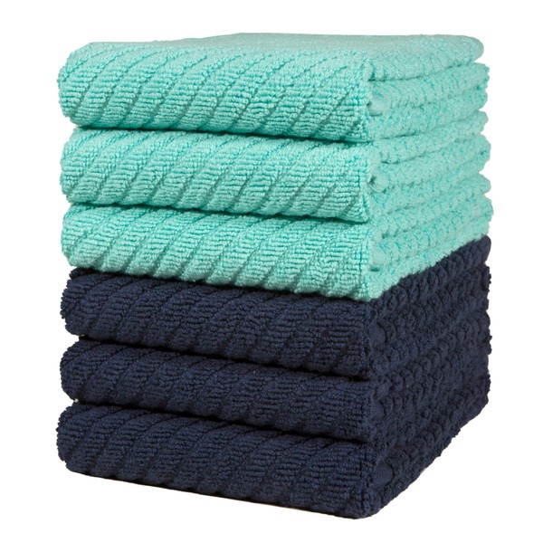 Premium Kitchen Towels (16”x 25”, 6 Pack) | Large Cotton Kitchen Hand Towels | Dish Towels | Diagonal Weave Design | 445 GSM Highly Absorbent Tea Towels Set with Hanging Loop | Aqua & Navy