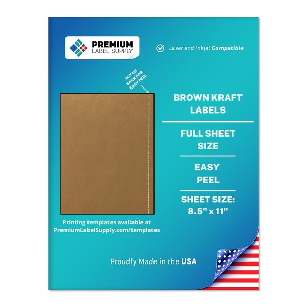 Premium Label Supply Brown Kraft Full Sheet Sticker Labels – 8.5” x 11" – Laser/Inkjet Compatible – 25 Sheets