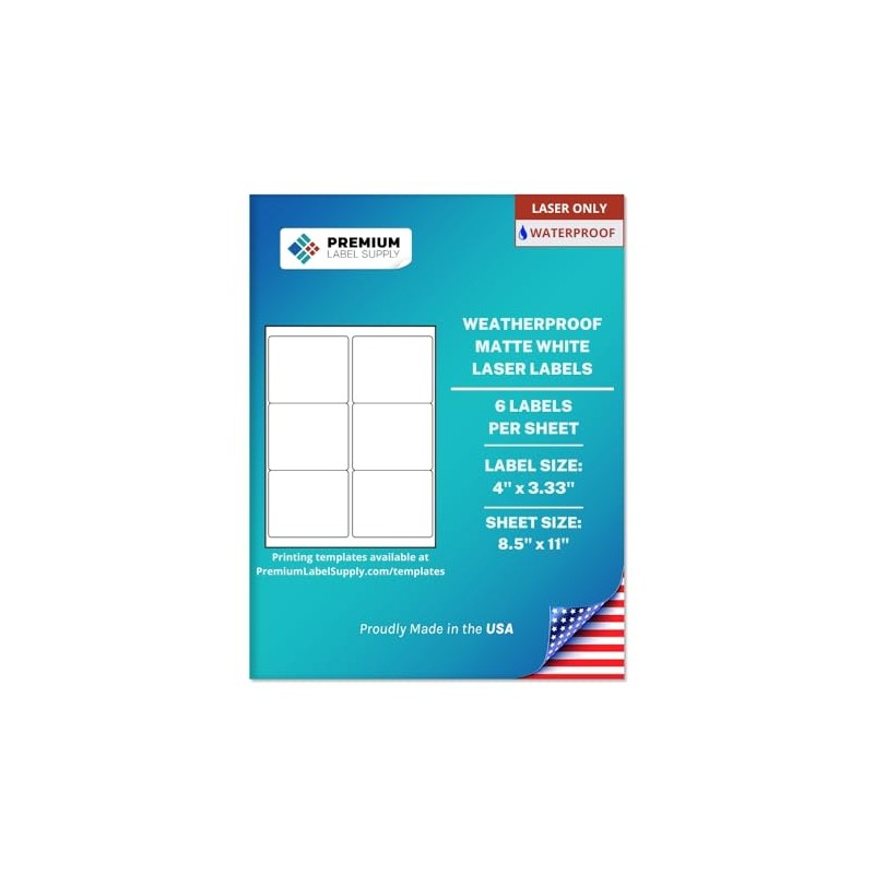 Premium Label Supply Waterproof Matte White Sticker Labels – 4" x 3.33" – Laser Printers Only – (6 per Sheet), 10 Sheets - 60 Total Adhesive Labels