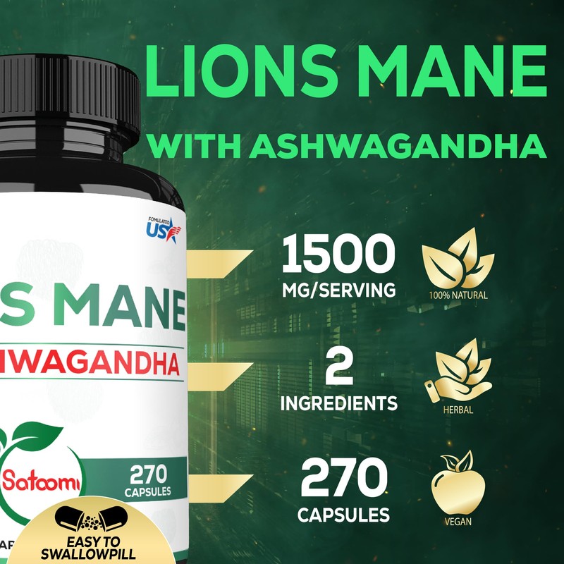 Satoomi Lions Mane Supplement Capsules with Ashwagandha Supplement - 270 Caps...