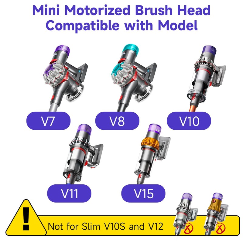 - The mini electric brush head is compatible with popular models such as Dyson V7, V8, V10, V11, and V15. The multi-functional anti-tangle vacuum cleaner brush head fits snugly with furniture vacuum cleaners and is designed to replace worn parts, allowing you to easily remove pet hair and dust from any surface. (Not suitable for slim S10S and V12, as they have different clip widths.)