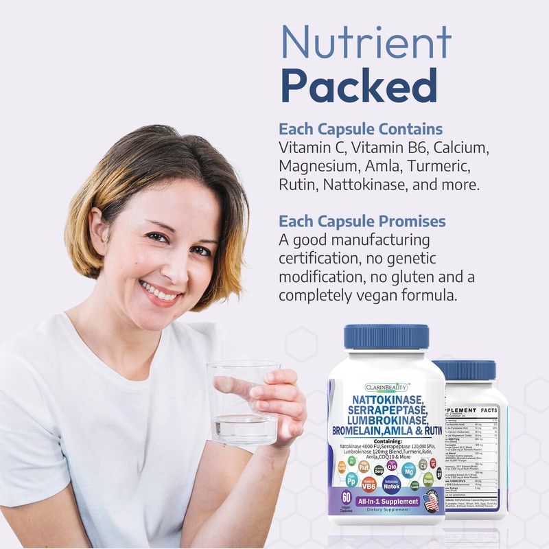 Premium Nattokinase 4000 FU Serrapeptase 120000 SPU Lumbrokinase 120mg with Tumeric, Rutin, Alma CO10, Vitamins B6 & C, Magnesium & More 60 Capsules Made in USA