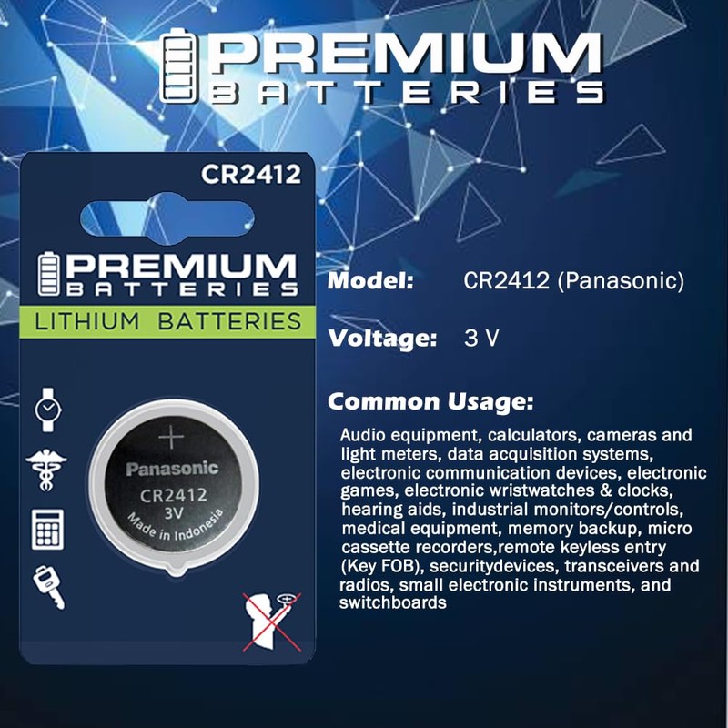 Two (2) Panasonic CR2412 Battery in new Child-Safe Retail Consumer Packaging, by Premium Batteries