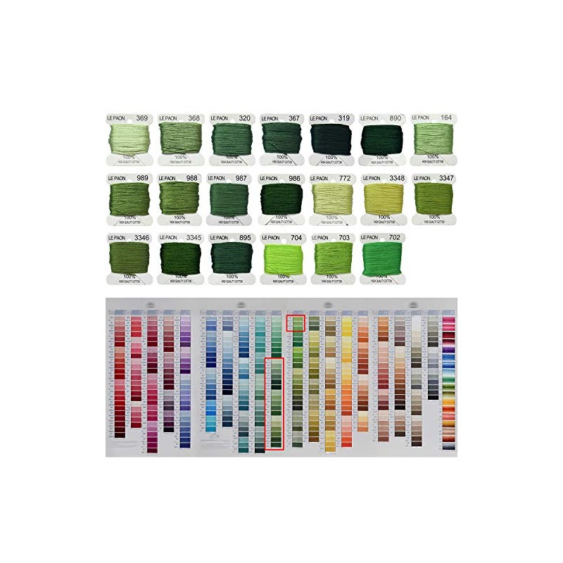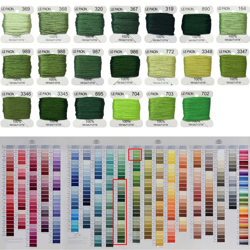 - Color: 20 Colors,all Colorfastt.All Bobbins Marked Color Number, Color Number are as follow:369,368,320,367,319,890,164,989,988,987,986,772,3348,3347,3346,3345,895,704,703,702