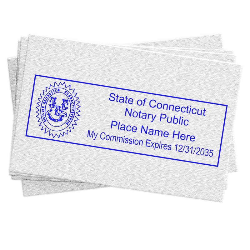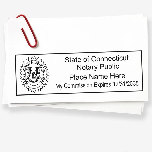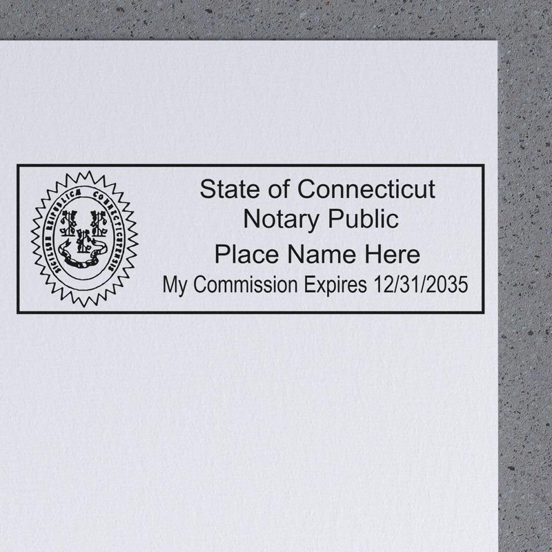 • NOTARIAL STAMP FOR CONNECTICUT ELEVATE YOUR NOTARIAL SERVICES with our Rectangular Self-Inking Connecticut Notarial Stamp. Tailored to meet Connecticut's legal standards, this stamp ensures full compliance with state laws, enhancing the professionalism of your services.