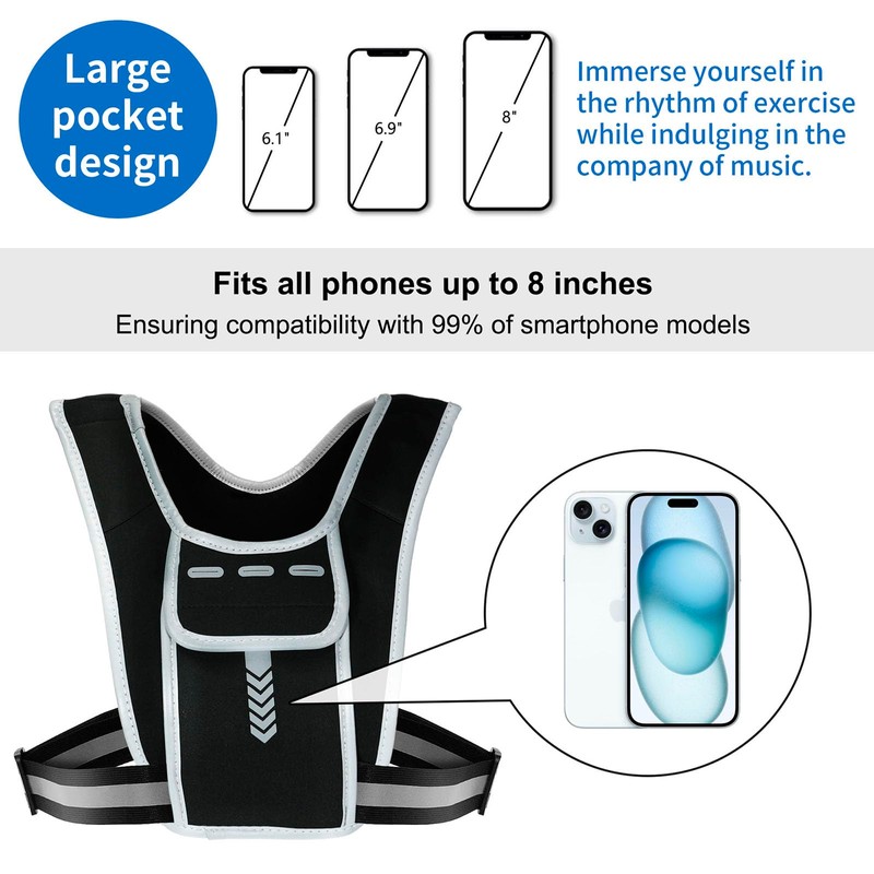 - Multiple Pockets: The vest boasts a front chest pocket securely holding smartphones up to 8 inches. It also comes with three headphone ports, enabling you to enjoy your favorite tunes on the go. For added convenience, shoulder pockets feature small compartments for keys or loose change. Lastly, at the back, a water bottle pocket holds a 500ML bottle, ensuring easy hydration during workouts.