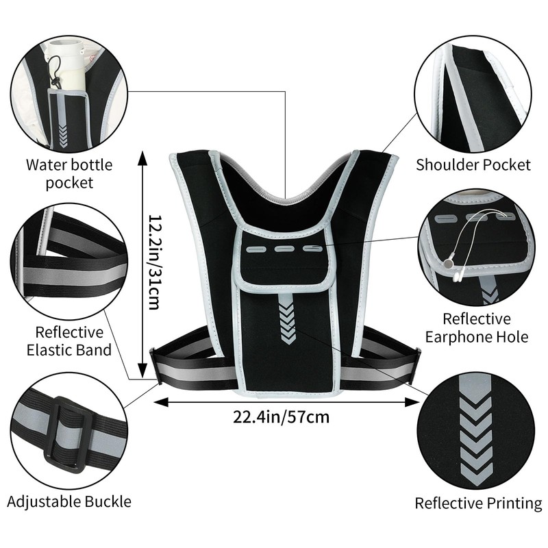 Premium Reflective Running Vest Phone Holder, Water Bottle Pocket, Adjustable Belt Band, Headphone Jack, Shoulder Pockets Key Holder, Adult - Unisex (Black)