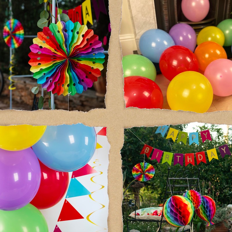 - All details – developed with a focus on quality and sustainability. This rainbow party set includes: 1 x multifunctional garland, 1 x pennant banner, 1 x paper garland, 8 x streamers and 7 x 3D honeycomb paper decorations (1 x ball, 2 x balloons, 2 x fluffy balls, 2 x discs).