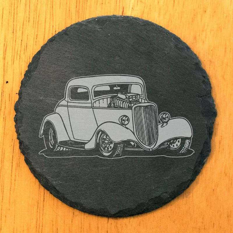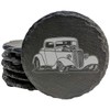 Premium Rustic Slate Coasters with Exquisite Laser-Etched Hot Rod Design | Elegant Home Decor and Unique Drinkware Protectors - Round Slate - set of 5