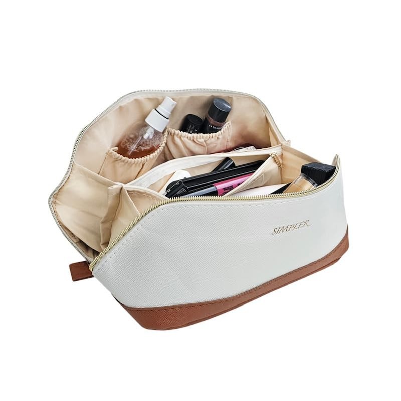 - PREMIUM DESIGN: Elegant cream-coloured toiletry case with tan trim and gold-tone hardware, perfect for sophisticated travel storage