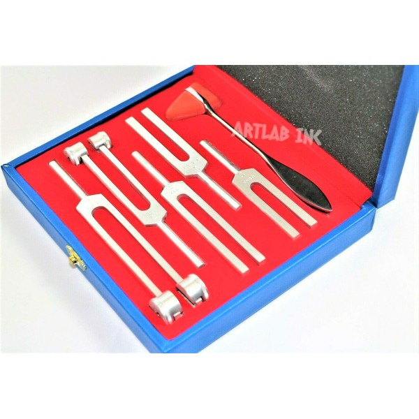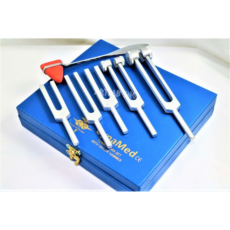 PRODUCT DETAIL : SET OF 5 TUNING FORKS + FREE TAYLOR HAMMER COMPLETE DIAGNOSTIC SET THIS SET CONSISTS OF 1-Taylor Percussion (Reflex) Hammer 1-C128, 1-C256, 1-C512, 1-C2048, 1-C1024 IN A NICE LEATHER CASE.