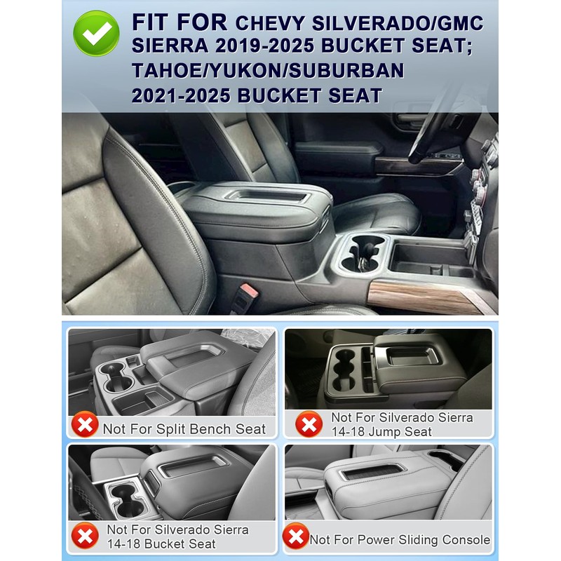 - 【Precision Fit】Custom-molded to match the original center console of Tahoe/Yukon/Suburban (2021-2025) and GMC Sierra/Chevy Silverado (2019-2025). Ensures seamless fit without gaps, perfectly aligning with armrest curves for a factory-like look. Note: Only fits floor-mounted bucket seat consoles — NOT compatible with split bench seats, jump seats, or fold-down armrests.