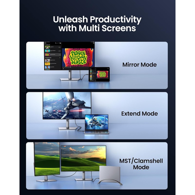 - Input: USB-C Male - Output: Displayport DP1.4 Female - Allows Viewing in Mode: Mirror + Extend + Duplicate - Supports Auto Audio and Video Sync