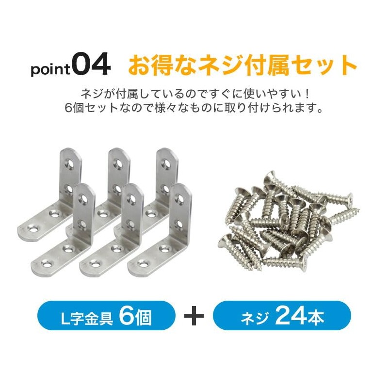 - Set Includes: L-shaped metal fittings x 6, screws x 24 pieces of the same color