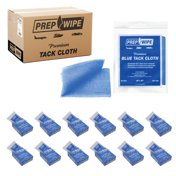 - 1 Case, 12 Boxes of 12 individually wrapped Prep-Wipes Tack Cloths (144 Tack Cloths Total). These large long lasting and tear resistant tack cloths measure 18" x 36" inches when unfolded, and they are made of gold colored soft cotton mesh material that contours to surface shapes for removing dust particles, dirt, lint, sanding residue, sawdust and other surface defect particles.