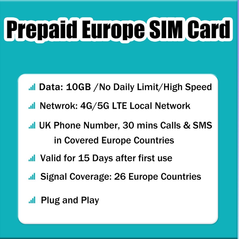 - A Must for Europe Travel : This prepaid Europe SIM card is 10GB of 4G Data to use in 26 Europe countries for 15 days. 30 mins calls and SMS between covered Europe countries with UK phone number. Data tethering/hotspot sharing allowed. Note: this SIM card can not make calls or send texts to the USA
