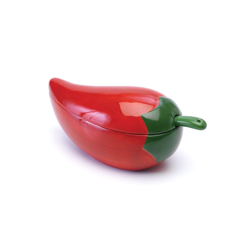 This Prepworks by Progressive Salsa Serving Bowl is shaped like a chili pepper. It is the perfect bowl for serving all types of dips and salsas. Made of hand painted ceramic , the bowl set includes a 6-1/2-inch serving ladle and lid. This bowl holds 1-1/2 cups of dip and is dishwasher safe.