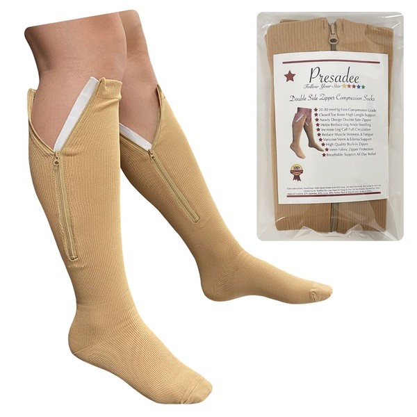 Presadee Double Side Zipper 20-30 mmHg Firm Compression Calf Leg Closed Toe Sock (Small-Medium, Beige)