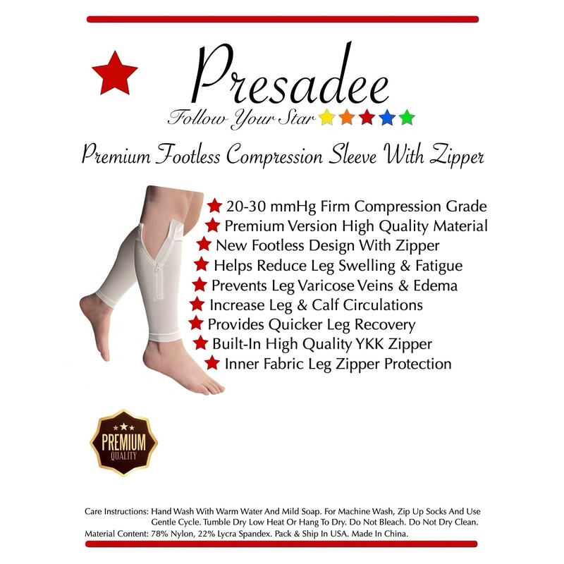 Proporciona un grado de compresión firme de 20 a 30 mmHg para el apoyo diario de las piernas. Ayuda a reducir el dolor de piernas, hinchazón, fatiga y edema. La compresión firme ayuda a mejorar y reducir la hinchazón de las piernas. Ayuda a energizar el movimiento de las piernas para una mejor fuerza de las piernas. Ayuda a aumentar la circulación de las espinillas para un mejor flujo sanguíneo y una recuperación más rápida. Edición premium en color blanco de producción limitada. Especialmente diseñado para nuestros clientes. Fabricado con material de alta calidad para todo el día. Nuestro diseño sin pies hace que sea mucho más fácil de poner o quitar en cuestión de segundos. Cremallera YKK integrada que proporciona un mejor soporte y una mayor duración. El tejido interior ayuda a proteger la cremallera de rozaduras contra la piel.