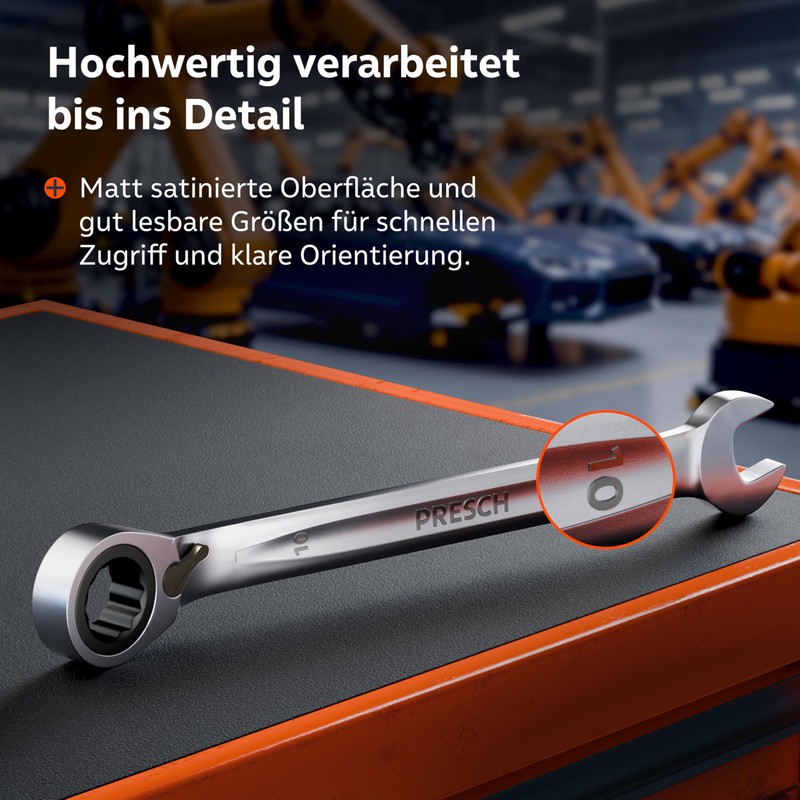 PRESCH Ratchet Wrench 10 mm Switchable - Minimum Return Angle (4°, 90 Teeth) - 15° Angled for Confined Places - Precision Milled, Robust Ring Ratchet Wrench