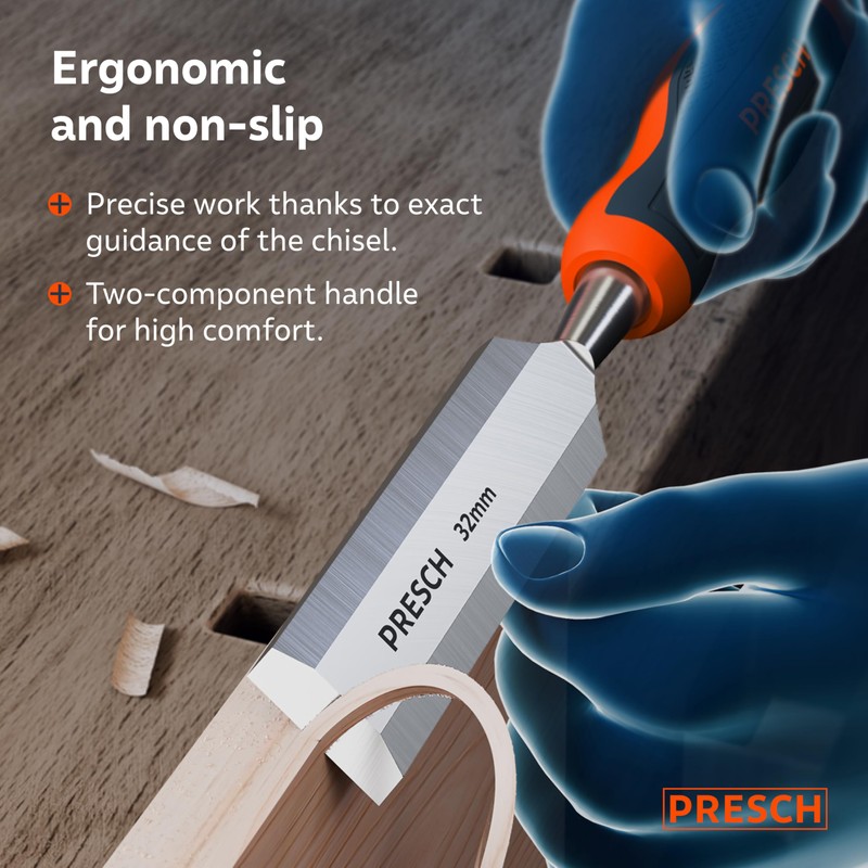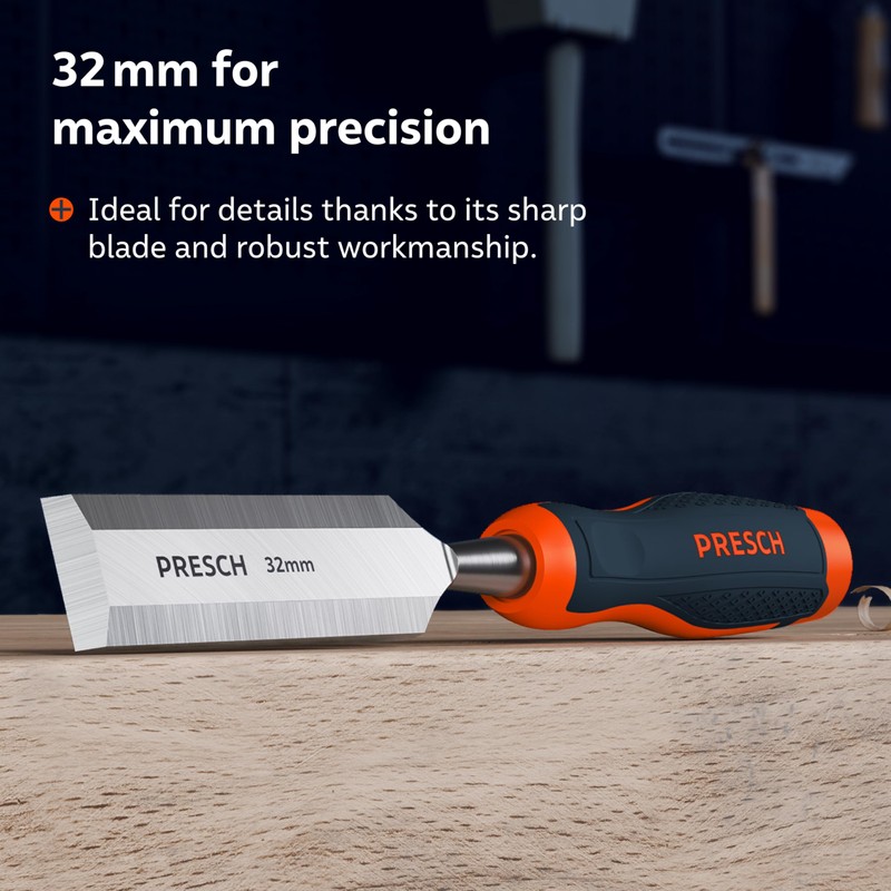 Presch Wood Chisel 32mm - Perfectly Polished for immediate use - for Professionals with 25° Angle - Robust Metal Impact Cap for Long-Lasting use - Ergonomic Handle for a Secure Hold