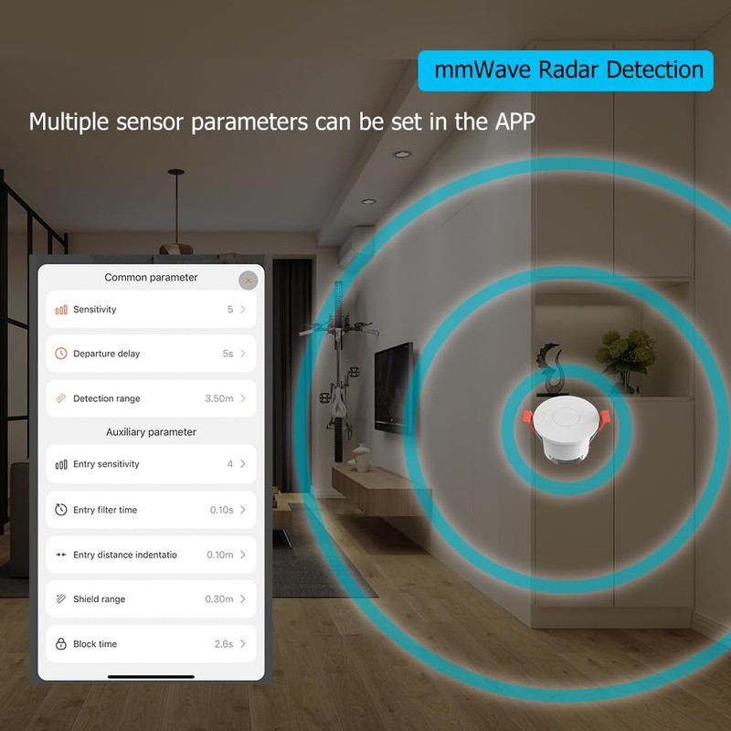 - 【Functional Wi-Fi Smart Human Presence Sensor】Featured as human presence,human static,human micro motion and human movement motion detection to detect the presence or absence of people in the area,even to detect the static state such as personnel sleeping accurately with mmWave Radar Detection featured.