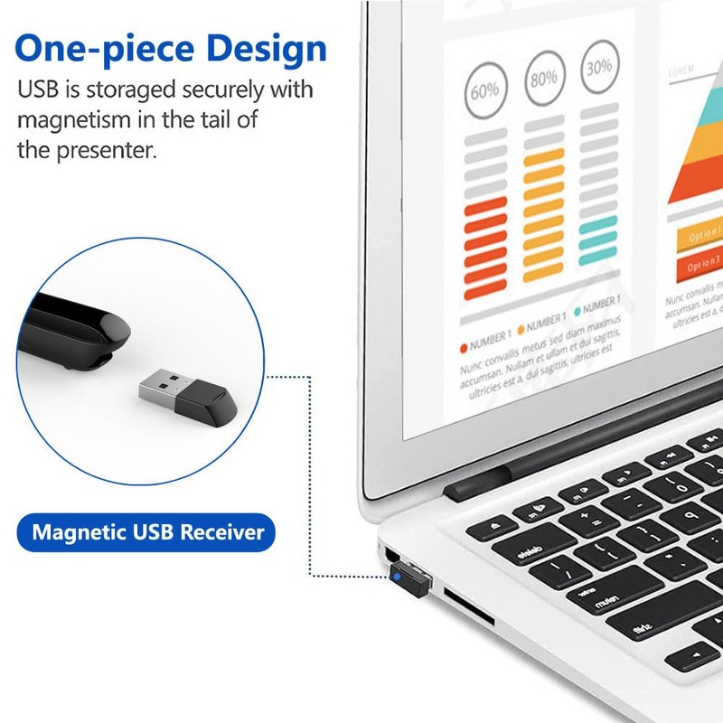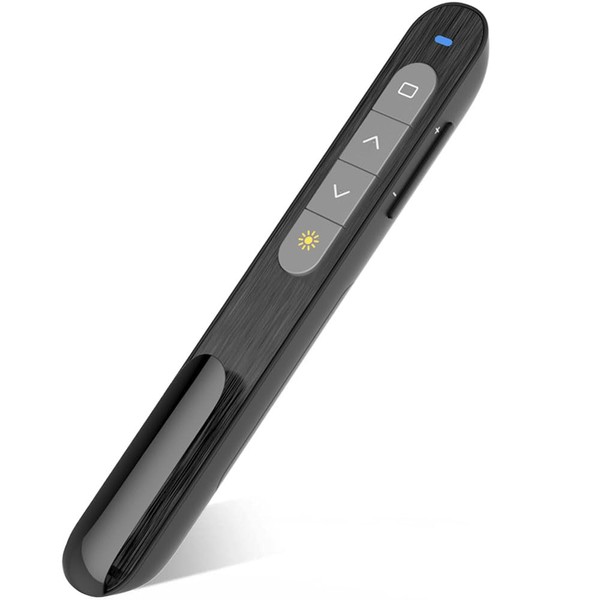 - 【Humanized Design】 With clip design, the presentation pointers can be clipped on your pocket or a folder, making it convenient to carry and fetch. The soft silicone buttons make your thumb feel comfortable. The raised bump on the keys can prevent you pressing wrong button. The Low Power Led indicator will flash when the power starts getting low. The USB receiver stores inside the bottom of this slide clicker.