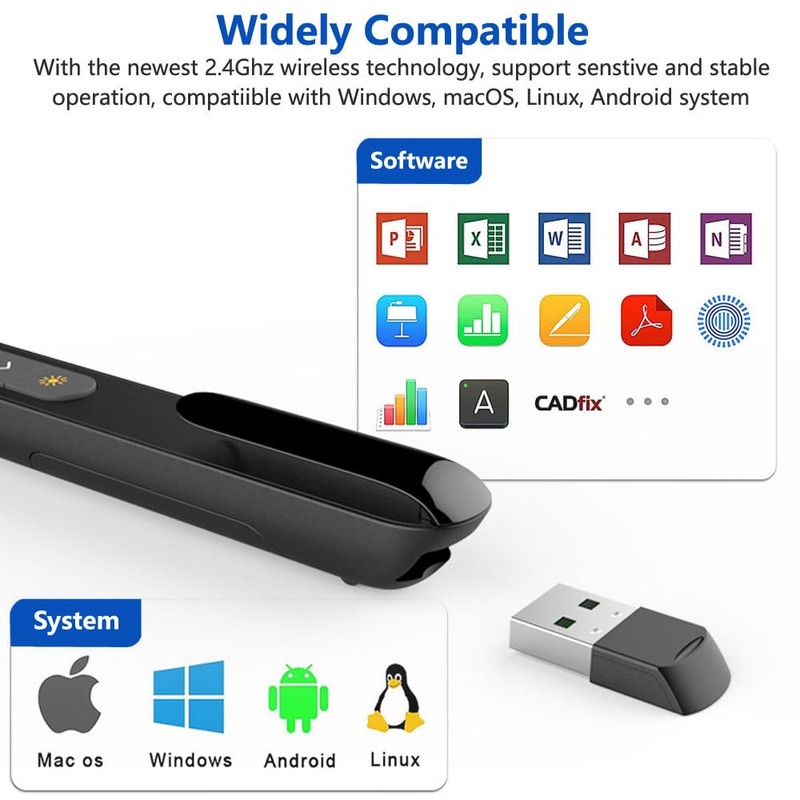 - 【Widely Compatible】The laptop clicker for powerpoint supports systems: Windows 2003 / XP / Vista / 7 / 8 / 10 /11, Mac OS, Linux, Android; Remote clicker for presentations supports software: PowerPoint, Google Slides, Keynote, Prezi, PDF, MS Word, ACD See etc.