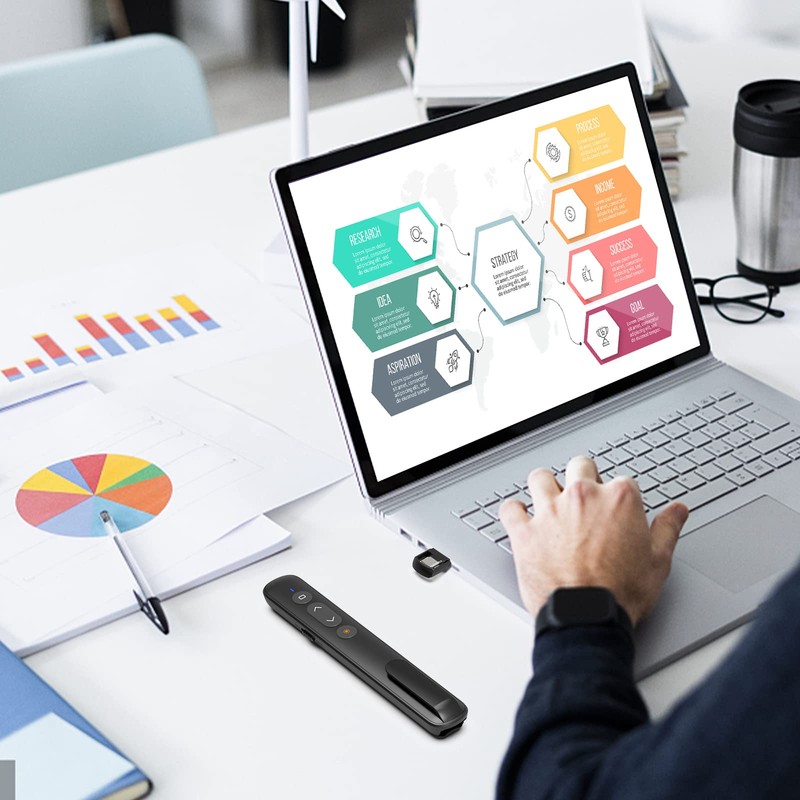 • Powerful features: the presenter has four soft and comfortable convex dot touch design, combines the functions of a laser pointer, page up, page down, full screen, black screen, low battery alarm, change window, enter hyperlink and volume control for presentations.