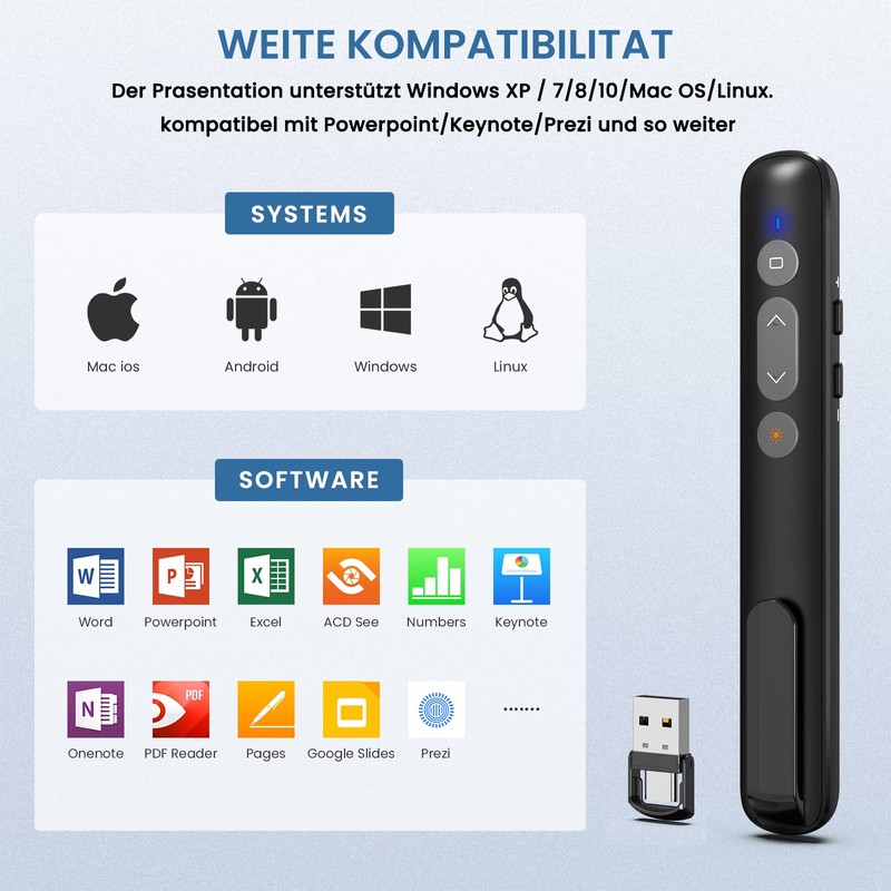 • Plug and play: no software needs to be installed. This presentation remote control supports the following operating systems: Windows 2003/XP/Vista/7/8/10, Mac OS, Linux, Android. Presenter with laser pointer supports software: PowerPoint/Keynote/Prezi/Word/EXCEL/ACDSee/iWork etc. A perfect presentation tool for lecturers, event presenters, teachers, sales managers and so on.