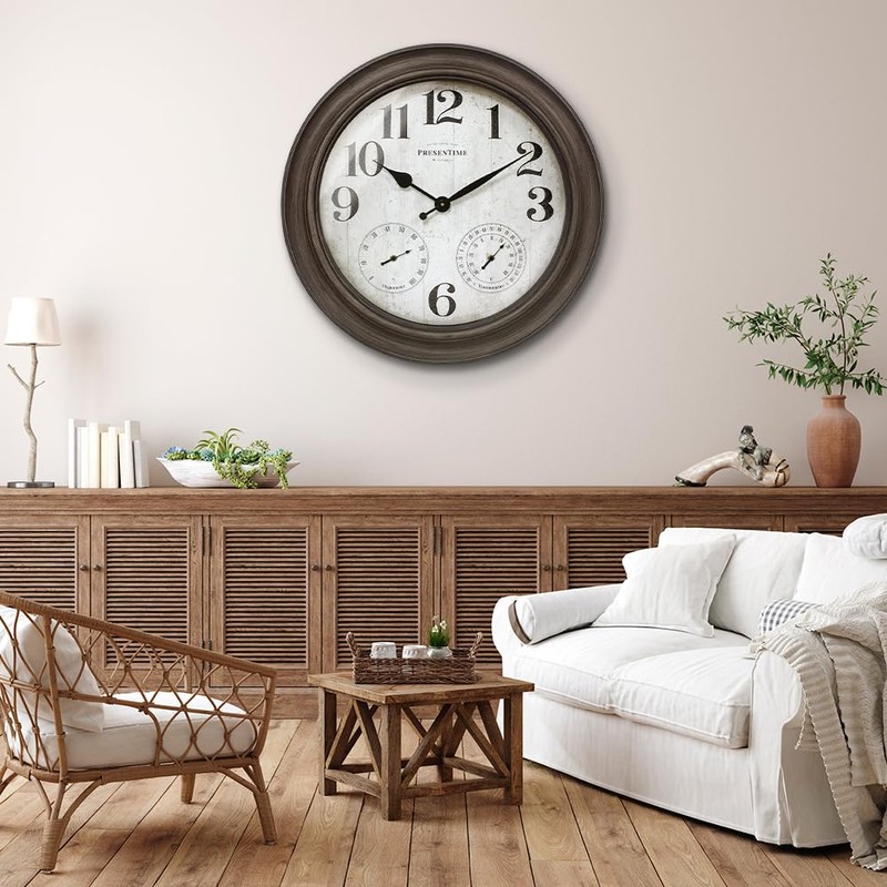 Presentime & Co. 26" Clifton in/Outdoor Farmhouse Clock with Thermometer & Hygrometer as All in One Weather Station, Farmhouse Wall Art and Timepiece for Home Decoration, Grey Oak Finish