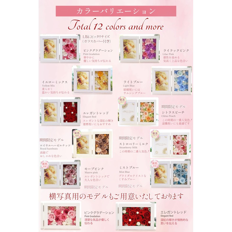 - [Product Details] This photo frame is the perfect size for vertical photos of regular L size. Size (H x W x D): Approx. 5.9 x 8.7 x 2.4 inches (15 x 22 x 6 cm); Flower Material: Preserved rose, Preserved cabsworm grass; Photo frame material: MDF / Glass cover on the surface