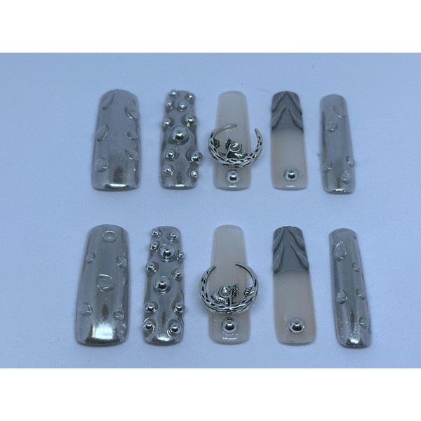 Press-On Fingernail Set, Assorted Sizes & Styles, Easy DIY Manicure (silver, M)
